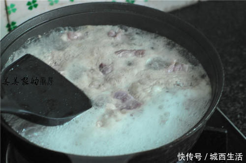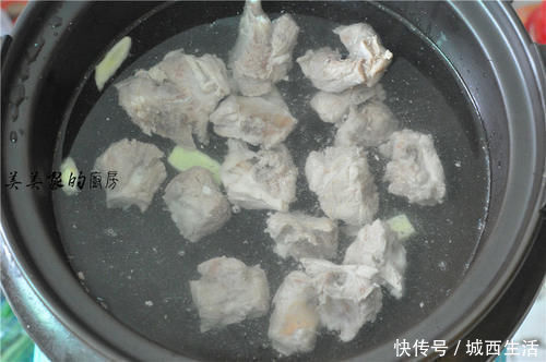 4.将排骨取出,放入新煮好的汤锅中,加几片姜片,盖上锅盖,用炖按钮将排骨炖半小时。排骨焯水后不要用冷水炖。加入热水,防止肉质缩水,这样炖出来的排骨会更加鲜嫩可口。